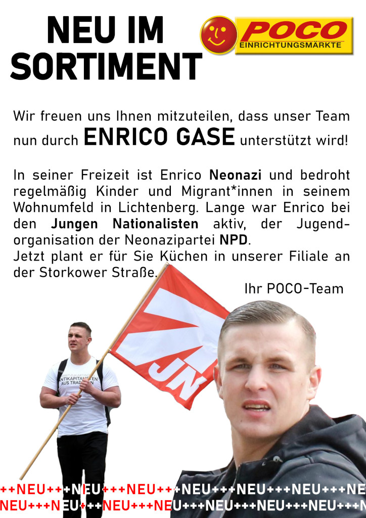 Enrico Gase (wohnhaft Herzbergstraße 154, Lichtenberg) arbeitet seit kurzem bei Poco (Hermann-Blankenstein-Straße 44, Friedrichshain) als Küchenplaner. Wir finden, Kund*innen und Belegschaft sollten wissen, mit wem sie es zutun haben.