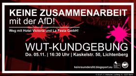 Lasst uns gemeinsam feiern, dass die AfD in Berlin nicht mehr in der Lage ist, sich bei seriösen Locations einzumieten, und stattdessen auf die La Festa GmbH und ähnliche Murkser angewiesen ist. Lasst uns gemeinsam ein wenig lachen und mit den nackten Fingern auf Vadim Derksen, Nicolaus Fest und vor allem auf Tatjana Korcistij-Gerlitz zeigen! Aber vor allem lasst uns laut und wütend klarmachen, dass wir wiederkommen, dass wir Nichts vergessen und dass die La Festa GmbH, das Hotel Pension Victoria und der La Festa Eventsaal erst wieder Ruhe haben, wenn die Zusammenarbeit mit der AfD ein für alle Mal beendet ist! Zur Hölle mit der La Festa GmbH! Kommt am 5. November um 16:30 nach Lichtenberg! Keine ruhige Minute mehr für die FreundInnen der AfD!